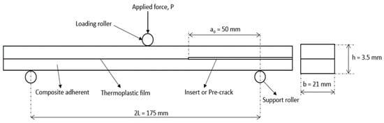 The effectiveness of the interleaved film and the role of the film thickness were studied in Mode I, Mode II, as well Mixed Mode cases according to ASTM D5528, ASTM D7905 and ASTM D6671 standards respectively [,,]. A mixed-mode test was important, as in reality, the different modes of failure mostly occur simultaneously and in a coupled manner. Among the many available test specimens, Double Cantilever Beam (DCB), End Notch Flexure (ENF) and Mixed Mode Bending (MMB) specimens were used for these studies.