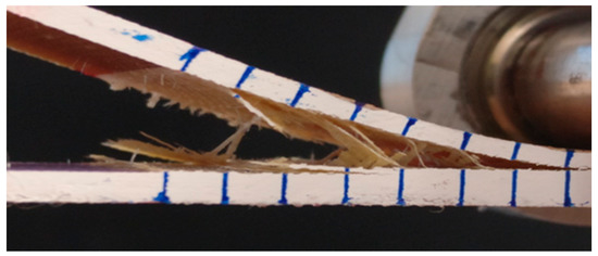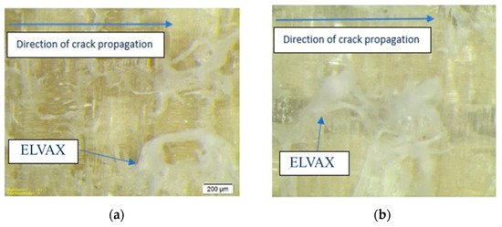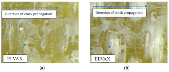The fracture surfaces of the MMB test specimen observed under an optical microscope are shown in Figure 19. The direction of the crack propagation and the adhesive layer is clearly marked on the same. Like the DCB and ENF specimens, the MMB samples had also experienced failure in cohesion in the adhesive. The bonding between both the surfaces was found to be proper and the used interleaving film was compatible with the glass/BMI. This failure mode is generally preferred as it ensures complete bonding between the adherends.