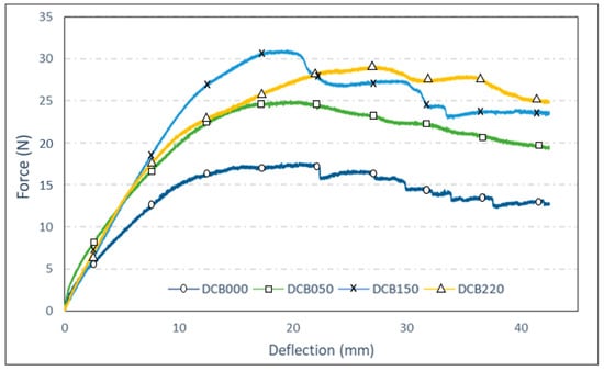 A graph of the applied load versus crosshead displacement for all the batches of GFRP tested in Mode I is plotted in Figure 11. The curves depict an average of all the specimens tested in each batch. The plots are a combination of smooth curves and regions with slight falls. The smooth curves prove that the observed crack growth for a displacement rate of 2 mm/min was stable. In the regions of fall, visible crack propagation as well as drop in the load was observed. Deviation from the initial linear curve indicates the onset of crack growth. Also, it is evident from the plot that the applied load value for all the cases increases almost linearly till it reaches the maximum, as the crack growth is arrested in this region. This maximum value coincides with the point when the crack starts to propagate. After crossing the maximum value, the load value decreases almost linearly as the crack continues to grow. In short, initially, there is an ascending region after which a plateau is present. This type of curve coincides with the well-known stick-slip behavior where the “stick” portion corresponds to the initial region of load increase and the “slip” corresponds to the region where the drop-in load occurs. During slip, some sounds were audible which corresponded to the matrix/adhesive cracking and in some cases, fiber pull-out.