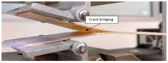 The load-displacement curve gets shifted upwards with increasing film thickness as evident from Figure 11. This implies that as the film thickness increased, the resistance to delamination also increased. This increase can be attributed to the crack bridging phenomenon caused by the adhesive interface as illustrated in Figure 12. The applied interleaving film layer provides extra bonding between the two adjacent plies and hinders the crack propagation, thereby increasing the delamination resistance, shifting the load-displacement curve upwards.