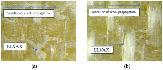The fracture surfaces (midplane of the laminate) of the DCB test specimen observed under an optical microscope are shown in Figure 10. The direction of the crack propagation is from left to right as indicated by the arrows. The adhesive was evident on both the top as well as bottom surface and hence the mode of failure endured was cohesive in nature in the adhesive. This assured that the bonding between both the surfaces was proper and the used interleaving film had been distributed throughout the surface of adjacent bonded substrates. It can also be inferred that the limiting factor for the bond strength was the characteristics of the used interleaving film and not any improper bonding technique. Hence the results of the conducted DCB tests are reliable and valid.