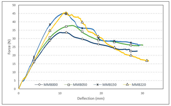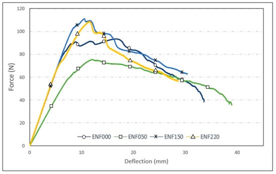 Figure 16 depicts a plot of applied load versus crosshead displacement for all the batches of GFRP tested in Mode II. Like the load-displacement curve of samples tested in Mode I, these plots show an average of all the specimens tested in each batch and are a combination of smooth curves and regions with falls. The crack growth could be tracked effectively using a displacement rate of 2 mm/min. Regions of fall coincided with load drop as well as slightly faster crack growth. This is because as the resistance to crack growth decreased, the load also decreased as indicated by the fall in the graph.