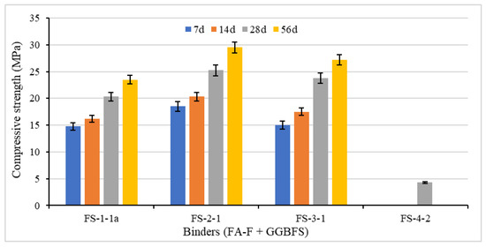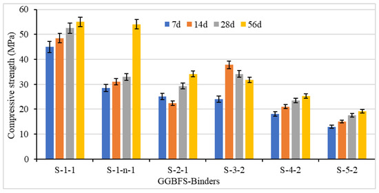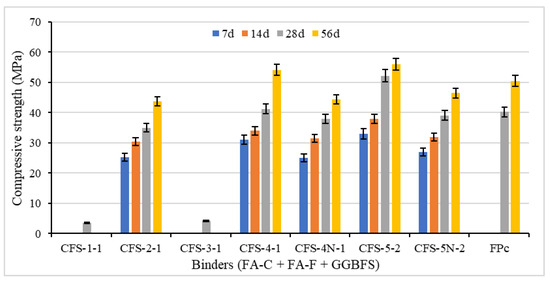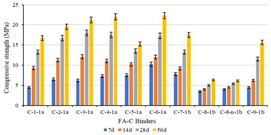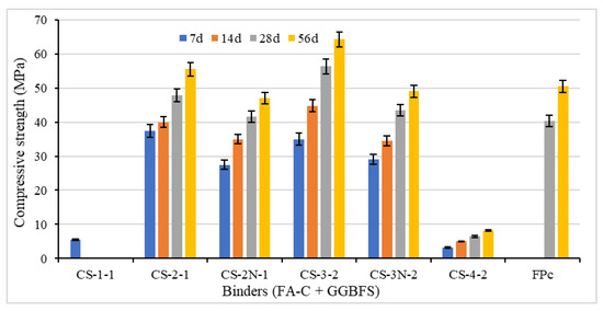 - Both binary (FA-C and GGBFS) and ternary binders having a GGBFS content of 40 to 45% obtained 8% to 34% higher compressive strengths than their counterparts having equal total fly ash and GGBFS content. Binary binder CS-3-2 composed of 55% FA-C and 45% GGBFS with reagent-2 (calcium hydroxide and sodium sulfate) obtained the highest compressive strength of 64.2 MPa at 56 days.