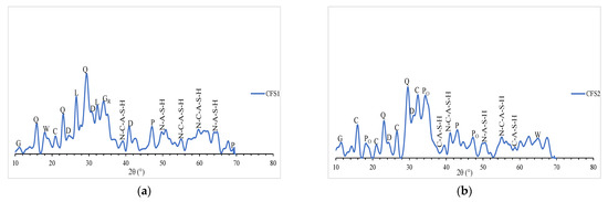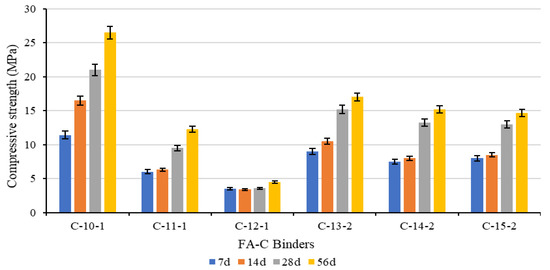 - Binary (FA-C and GGBFS) and ternary (FA-C, FA-F, and GGBFS) binder compositions having a GGBFS content of 40% to 50% incorporating reagent-1 (Ca(OH)2:Na2SiO3·5H2O = 1:2.5) and reagent-2 (Ca(OH)2:Na2SO4 = 2.5:1) were determined to be optimized compositions in terms of desired workability (slump flow spread >155 mm) and 28-day compressive strength (>38 MPa).