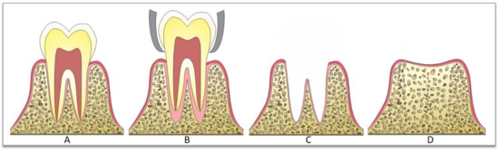 Diagram showing the change in the volume of the alveolar bone ridge due to bone loss before tooth extraction. (A) Proper dental implantation. (B) Alveolar bone loss due to periodontal disease. (C) Bone condition after tooth extraction. (D) Alveolar bone healing.