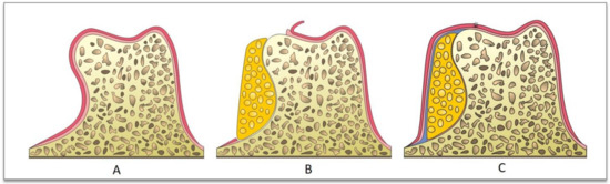 Diagram showing a regenerative technique in an area with the bone defect. (A) Alveolar ridge with a bone defect in thickness. (B) Bone graft adapted to the area of the defect and membrane positioned. (C) Suturing the grafted area.