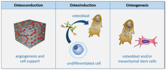 Since bone repair depends on mechanisms of osteoconduction, osteoinduction, and osteogenesis, the ideal bone graft should guide the bone growth three-dimensionally, establishing cell recruitment, inducing differentiation of resident bone cells, and providing cells at the implantation site [18] (Figure 6). For many years, autogenous bone grafts had been considered the reference standard for the treatment of bone defects. In addition to having imunocompatible cells, they are osteogenic, osteoconductive, and osteoinductive presenting characteristics of bioabsorption and angiogenesis, which guarantees high clinical predictability [19,20]. While osteoinductors are biomaterials that stimulate undifferentiated cells to differentiate into osteoblasts, osteoconductors act as a framework for the proliferation of blood vessels, perivascular tissue, and osteoprogenitor cells of the patient. Osteogenitors biomaterials are capable of forming bone tissue by themselves since they have viable precursor cells and/or osteoblasts [21].