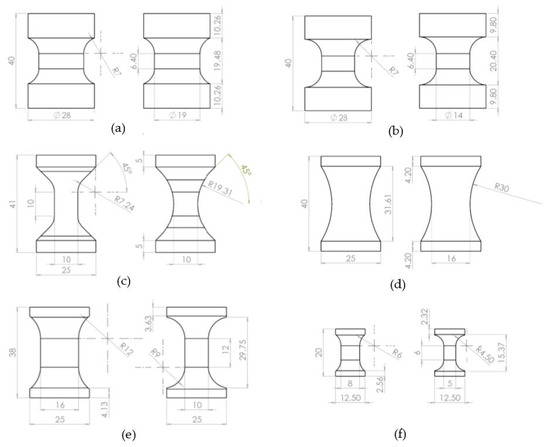 Engineering drawings of direct geometries. (a) Spool A, (b) spool B, (c) bi-lateral waist, (d) RARDE Type II, (e) RARDE Type III, and (f) RARDE Type III (mini).