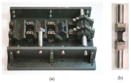 Initially, a minimum of 20 mm was trimmed from the edge of the laminate to remove potential material imperfections. Then, specimen blanks were extracted using a 1 mm thick diamond slitting blade and machined to the required geometries (Figure 1 and Figure 2) by surface grinding using resin-bonded diamond grinding wheels. The process of surface grinding ensured that the machine-induced surface damage was minimised. Visual shadowgraph inspections were undertaken on the machined areas of the specimens to ensure machining did not produce notches or other unacceptable features, alongside ensuring that the checking dimensions were within the specified tolerances as defined in each test standard. Following machining, direct loading specimens were bonded to 316 stainless steel end-loading bars using Redux 312 epoxy film adhesive (Figure 3). Specimen ends were dry grit blasted and cleaned with isopropanol before being assembled, with the film adhesive, in alignment bonding rigs (Figure 3a). Assembled specimens were placed in an oven to cure the adhesive using the following cure cycle: 2 °C/min ramp to 120 °C, 1 h dwell at 120 °C, air cool to room temperature. Preparation for spool-type specimens differed, as these were first turned to form oversized cylindrical blanks before being bonded to internally threaded cylindrical steel end bars. Specimens were turned to the required outer diameter as a composite-steel assembly to maintain symmetry during turning and then waisted to the required geometry. Three-point bend and punch-out specimens were tested as machined. In line with the recommendations in [2], to prevent bending during loading, cruciform specimens had 2 mm thick steel beams bonded to the arms of the specimen using the procedure described above.