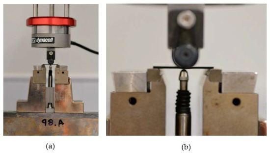 Flexural three-point bend tests were carried out in accordance with the procedure described in ISO 20975-2 [4]. Specimens were centred on 4 mm diameter support rollers spaced to give a support span of 25 mm and loaded using a 10 mm diameter-loading roller to failure (Figure 4). Beam deflection at the centreline was measured using a linear variable differential transformer (LVDT) to calculate strain. Young’s modulus (E33T) was determined between 0.01 and 0.30% strain, as prescribed in ISO 20975-2 [4]. T-T tensile stress (σ33T) was calculated from the flexural load (), span length (), specimen width (), and thickness () using the following equation: