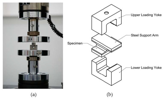 Test set up for cruciform testing: (a) image of test set-up and (b) exploded diagram.