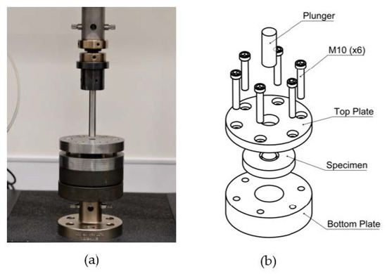 Cylindrical punch-out tests were undertaken based on the method described in [3]. To prevent bending, specimens were placed between two circular steel plates with a bore for the entry of a push rod. The plates were secured together with six M10 bolts circumferentially positioned around the plate and torqued to 5 Nm to ensure uniform pressure on the specimen. Then, a 15 mm diameter push rod was used to load the specimen until failure. The plates had recesses to ensure specimen alignment and were positioned on a spherically seated compression platen to maintain uniform loading (Figure 6).