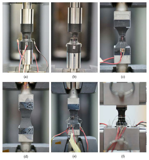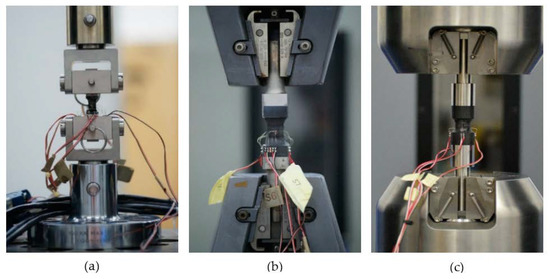 Before testing direct specimens, test machines were aligned to minimise machine bending contributions. An alignment specimen was used to adjust the angularity and concentricity of the load string to give a minimum of Class 5 in accordance with the guidance in [13]. The only exception to this was RARDE Type III (mini) specimens, which used a self-aligning coupling fixture as shown in Figure 7a. Representative images of the test set-up for other direct loading tests are provided in Figure 7b,c. Specimens were gripped and loaded to failure through their end-loading bars in either manual or hydraulic wedge action grips. Strain was measured on test specimens using Tokyo Measuring Instruments Laboratory (TML) strain gauges bonded parallel to the loading direction at the mid-section of the specimen gauge length using cyanoacrylate adhesive. Strain gauges, either uniaxial (TML FLA-2-11) or biaxial (TML FCA-2-11) for measurement of Poisson’s ratio, with active lengths of 1 or 2 mm were used dependent on the geometry and specimen gauge length, as detailed in Table 3. Test results were considered valid if bending was <10% across front-to-back and left-to-right faces of the specimen (measured between 10–90% of the failure load). Elastic properties (E33T, ν31, and ν32) were determined between 0.05–0.25% strain. T-T tensile stress (σ33T) was calculated from the failure load (), specimen width (), and thickness () measured within the specimen gauge length using the following equation: