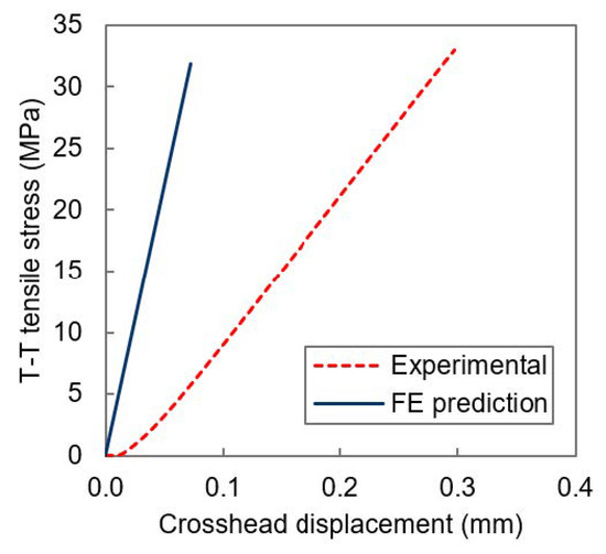 Experimental and FEA predicted stress–displacement curves for the cruciform geometry.