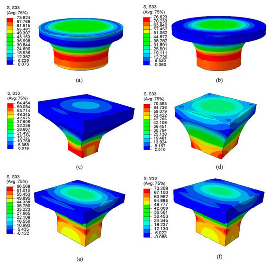 Stress contour plots for (a) spool A, (b) spool B, (c) bi-lateral waist, (d) RARDE Type II, (e) RARDE Type III, and (f) RARDE Type III (mini) geometries.