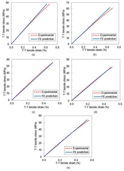 Comparing the experimental and FEA results (Table 6 and Table 8, respectively), the predictions are close to the experimental data for all the geometries, as shown in Figure 15, which compares the experimental and predicted tensile stress–strain curves for five direct geometries (there was no experimental strain data for the RARDE Type II specimen). The FEA predictions align closely with the experimental data, though in the two spool-type geometries, there is a slight deviation at higher strains as the experimental stress–strain curve becomes non-linear.
