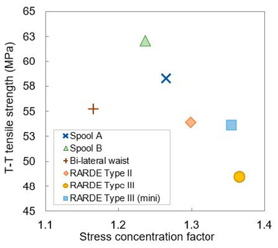For the direct loading cases, the three geometries with the lowest stress concentration factors have the highest strengths, although it does not follow that the geometry with the lowest stress concentration factor has the highest strength. The three RARDE geometries have higher stress concentration factors with the RARDE Type III displaying the highest stress concentration factor (scf = 1.37) and the lowest strength (48 MPa). Plotting failure strength against stress concentration factor shows the existence of some outliers (Figure 16). The RARDE Type III (mini) geometry has a slightly higher strength (54 MPa) than expected based on the high stress concentration factor (scf = 1.36). This is also likely to result from a volumetric effect. Conversely, the bi-lateral waist geometry has a lower strength than expected (scf = 1.17, σ33T = 55 MPa). The value of 1.17 for the geometries stress concentration factor is in good agreement with the findings from Hoffman et al. [8], who reported a value between 1.1 and 1.2. The bi-lateral waist specimen is the only geometry in which there is a large peak stress area in the gauge region (Figure 14c), meaning that these peak values will have been included in the calculation of the average stress in the gauge region. Hence, the difference between the average stress and the peak stress will not be as large as it would have been if the peak stress was away from the gauge region.