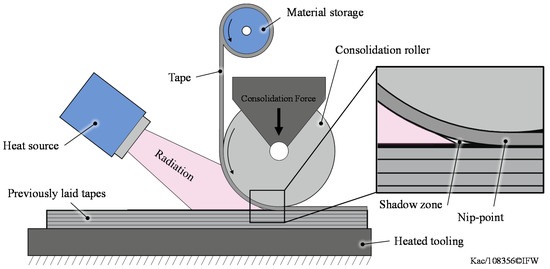 Therefore, Laser-based TAFP systems (Figure 1) are used for in situ manufacturing TPC structures, since lasers offer energy-efficient heating as well as fast and precise control response. However, due to the large housing, the laser must be used at a certain angle to the substrate surface which leads to a shadow zone in front of the nip-point [4,7,8,15]. Depending on the flexibility of the consolidation roller (e.g., a rigid steel roller [9,10,11,12,13,14,18] or a flexible silicone roller [4,7,15,19,20,22,23,24]), a larger or smaller shadow zone arises. As a consequence, the nip point cannot be reached directly with the laser radiation, so both the tape and the substrate are only heated by reflected laser radiation [4,8,23] which leads to a temperature loss towards the nip point [18]. This drop in temperature can cause a sub-melt temperature at the nip-point and thus a high viscosity of the material which results in low intimate contact, high porosity and poor consolidation quality. The temperature loss can be compensated by heating the tape and the substrate in front of the shadow area above melting temperature [4,7,8]. Depending on the laying speed and the size of the shadow area, the temperature can rise up to 550 °C when processing carbon-fiber reinforced polyetheretherketon (PEEK/CF) [18]. Due to the fast overheating of the material near to the degradation temperature, fiber-rich surfaces can occur and thus time-consuming percolation must be considered for high intimate contact. A consequence of this degraded matrix material is a decrease in bonding strength [24,25,26,27,28]. Furthermore, due to the high temperature deconsolidation effects, e.g., void growth as a consequence of temperature-dependent gas expansion, are observable [29].