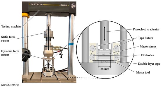 For the preliminary experimental investigations, a test setup (Figure 2) was designed to simplify and transfer the AFP consolidation process into an INSTRON 8870 universal testing machine (Norwood, MA, USA) considering a stamp/tool system. The stamp has a flat area of 35 mm × 15 mm (length × width). With reference to the width of the prepreg tapes, double-layer unidirectional specimens with a size of 35 mm × 11.5 mm can be manufactured using this test setup.