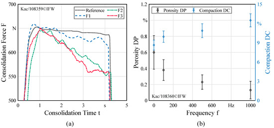 (a) Measured static consolidation force in relation to the consolidation time for the varied excitation frequencies; (b) Degree of Porosity (DP) and Degree of Compaction (DC) in relation to the varied excitation frequencies determined by Laser Scanning Microscopy.