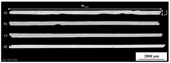 To determine the compaction of the origin tape, cross-sectional images were taken with 240× and 480× magnification. The recording and processing of the image data were carried out with Keyence Multi-File-Analyzer® software. To determine the tape width wcons after consolidation, the recordings were made with a 240× magnification. During the recording, the micrographs were automatically stitched to form an overall image. To determine the tape thickness tcons after consolidation, the micrographs were analyzed as individual images with a 480× magnification. The thickness was evaluated at ten points on the samples, which were evenly distributed throughout the width of the tape. Based on the condition of the semi-finished product with a width of 11.5 mm and a tape thickness of 160 µm, or 320 µm for the double-layer specimen, the tape compaction was analyzed. For calculation of the degree of compaction (DC) with Equation (1), the cross-sectional areas (CSA) were formed from the tape width wcons and the mean value of the tape thickness tcons and expressed in relation to the initial area A of 3.68 mm2 (11.5 mm × 0.32 mm).