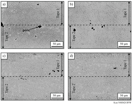 The LSM micrographs with 1200× magnification (Figure 5) exemplarily show the decrease in the number and size of interlaminar pores which is a consequence of the change in viscosity according to well-known intimate contact models. Additionally, in Figure 3b a decreasing trend in the degree of porosity over increasing frequencies is observable. The pore content reduces from a mean value of 0.6% in the reference experiment to 0.38% in the 100 Hz-experiment. The experiments with higher frequencies also show a decrease in porosities from 0.23% in the 500-Hz experiment to 0.13% in the 1000-Hz experiment. The standard deviation of the determined values is high with regard to the absolute value which agrees with the expectation that the effect is only small due to both the change in viscosity and consolidation pressure. Compared to porosity values obtained in other research on the topic of laser-based in situ TAFP, the porosity values obtained in this work are generally very low. As can be seen in Table 3 the porosity values for PEEK/CF laminates manufactured utilizing laser-based TAFP are between 2 and 4.5%. Since the development of intimate contact and thus the development of interlaminar porosity is time-dependent [9,10,11,12,13] the low porosity values are caused by the consolidation time of 3 s which is quite long compared to typical TAFP consolidation times.
