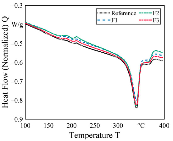 To evaluate the influence of vibrations on recrystallization of the PEEK material after consolidation, the degree of crystallization was calculated according to Equation (3) for three different vibration-assisted consolidation forces and the reference experiment. The reference sample had not been exposed to vibration during consolidation; the other samples were consolidated with a frequency of 100 Hz, 500 Hz and 1000 Hz. In Figure 6, for all the different samples the melting peak of the first heating cycle is shown. It is observable that the curves are nearly congruent. All the curves have no recrystallization peak, which means that the cooling rate during consolidation is slower than 15 K/s. The degree of crystallization amounts by the reference sample 38%, which is the highest degree of crystallization of the four samples. In contrast, the lowest degree of crystallization is reached by a frequency of 100 Hz and amounts to 32%. The samples which were consolidated with a frequency of 500 Hz and 1000 Hz have a degree of crystallization of 35%. At the second heating cycle all samples have also nearly the same degree of crystallization of about 35%, thus it was shown that the vibrations do not damage the polymer chains. The DSC experiments also show that the frequency has no remarkable influence in the crystallization process.