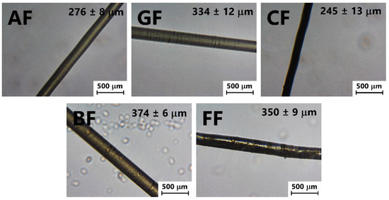 Aramid fabric (AF) delivered by P.P.H.U. SURFPOL (Poland) with a twill weave (twill 2/2) and a weight of 300 g/m2 was made using Tex 240 fibers. Sewn glass fabric made of E-glass (GF) BIAX 400 g/m2 manufactured by Saertex GmbH & Co. KG (Germany) is a two-way fabric (+45/−45°) with a grammage of 411 g/m2. Carbon fibers (CF) as sewn carbon fabric trade name BIAX 400 g/m2 were delivered by Saertex GmbH & Co. KG (Germany). It is a two-way fabric (+45/−45°) with a grammage of 410 g/m2. Basalt Multiaxial Fabric (BF) BAS BI 450 by Basaltex NV (Belgium) is a two-way sewn fabric (+45/−45°) with a grammage of 464 g/m2. For the manufacturing of the composites, a flax fabric (FF) manufactured by Safilin (France) with a twill weave (2/2 twill) and a grammage of 500 g/m2, made of Tex 400 fibers was used. Figure 1 presents the photographs of all used fabrics, while Figure 2 shows the images of single fibers under magnification of ×500 and the average fiber thickness.