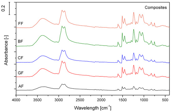 The chemical structure of used fibers and epoxy composites reinforced with various fillers were assessed by the FTIR method. The measurements were realized in FTIR-ATR mode, and the analysis is concerning the chemical structure of the fibers and composite surface. Figure 3 presents the FTIR spectra of used reinforcements. The characteristic absorption bands for each fiber may be observed. The complex FTIR spectra of AF consist of as listed prominent absorption bands 3300 cm−1 (N-H stretching), 1638 cm−1 (C=O stretching, Amid I), 1536 cm−1 (coupled C-N stretching and in-plane N-H bending, Amid II), 1400 cm−1 (primary amine salt), 1306 cm−1 (C-C, C-N group motion and N-H vibrations, Amid III), 1103 cm−1 (C-H in-plane bending), 892 (C-H out of plane), 862 cm−1 (C-H out of plane bending), and 725–844 cm−1 (N-H and aromatic C-H out of plane bending) [51,52,53,54]. For both inorganic fillers, i.e., BF and GF, the most distinct wide absorption band with a maximum at 897 cm−1 was originated from SiO stretching mode [55]. For glass fiber, additional absorption bands were observed resulting from the silane coupling agent, including at 1715 cm−1 (C=O stretching) and 720 cm−1 (the presence of residual water) [55,56]. The lack of absorption bands in considered wavelength is characteristic of CF [57]. For FF fiber, several absorption bands were denoted, including 3337 and 3296 cm−1 (O-H stretching band), overlapping 2900 and 2896 cm−1 (C-H stretching and C-H2 symmetrical stretching), 1713 cm−1 (C=O carbonyl stretching of hemicellulose), 1620 cm−1 (water absorbed in cellulose), 1432 and 1372 cm−1 (-CH3 asymmetric and C-H symmetric deformations from lignin), 1335 cm−1 (aromatic ring of the cellulose), 1101 cm−1 (C-O-C symmetric glycosidic stretch), 1052 cm−1 (C-OH stretching vibration of cellulose backbone), and 896 cm−1 (phase ring stretching from the cellulose backbone) [58,59,60].