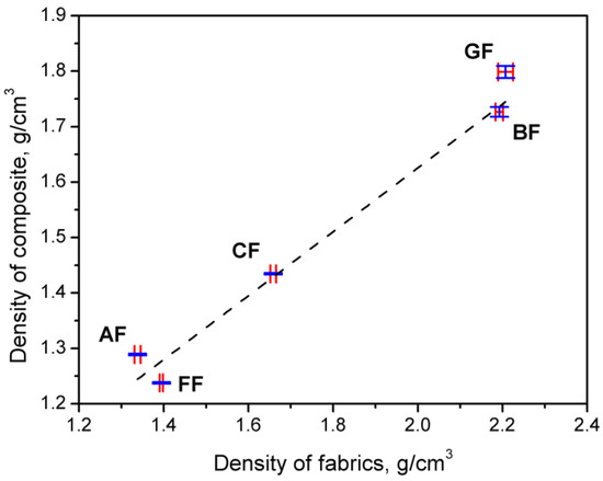 Figure 5 shows the relationship between the density of applied fabrics and manufactured composites. Presented values are related and proportional, and any deviations result from the differences in the chemical structure of fabrics and possible porosity. Such an effect may be associated with the inaccuracies during hand lay-up lamination, but mostly with the differences in particular fabrics’ chemical structure, presented in Figure 6.