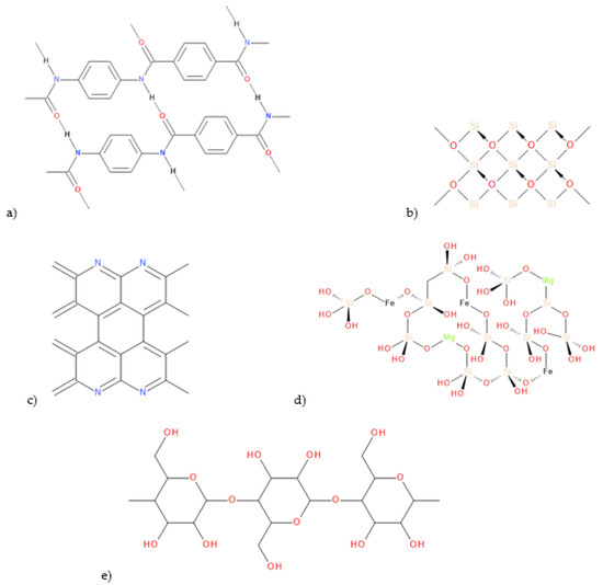 Chemical structure of the fibers: aramid fiber (AF) (a), glass fiber (GF) (b), carbon fiber (CF) (c), basalt fiber (BF) (d), flax fiber (FF) (e).