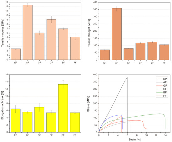 Aramid, glass, carbon, basalt, and flax fibers were used to compare the epoxy-based composites’ properties with similar grammage fabrics comprehensively. The proposed hand lay-up method, using six layers and the same amount of resin, allowed the formation of composites with the desired properties. Proper saturation of all fabrics by epoxy matrix and creating a coherent layer at the composite’s surface positively impacted the performance. The highest mechanical properties characterized composites reinforced with aramid fabrics, which showed a tensile strength of 360 MPa and Young’s modulus of 12.3 GPa, which adequately gave about 500% improvement of both parameters compared to epoxy resin. The lowest reinforcing efficiency was observed for glass fiber reinforced composites; however, GF composites also showed more than twice higher stiffness than EP.