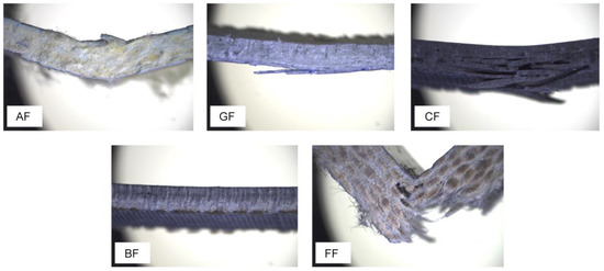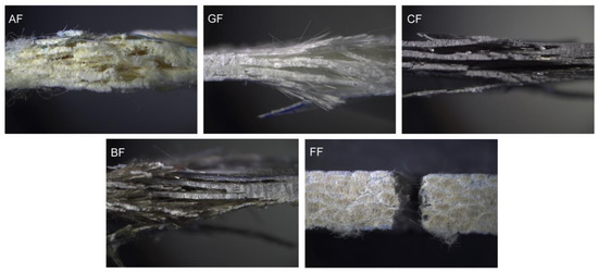 Figure 8 shows the composite samples’ profile view after the tensile test, taken using an optical microscope. Based on the images of composites except for FF, referred to the example of the stress–strain curve, it can be stated that cracking at the interface of matrices occurs at the point of maximum stress and then propagates along the fibers and, as a result, appears at the external surface of the sample [66]. In summary, the cracking mechanism of the samples subjected to stretching in the samples AF, BF, CF, and GF is characterized by a dominant debonding effect, leading to a pull-out phenomenon of the fibers [66,67,68]. A different cracking mechanism was observed only in FF composites, which ultimately broke during the tensile test and showed no distinct interlaminar breakages. This may be related to the lowest mechanical strength of the natural fibers themselves.