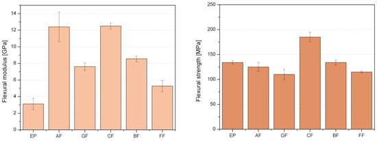 The mechanical properties of unmodified epoxy and its composites with different types of fibers assessed in three-point bending test, realized up to strain calculated according to ISO 178 standard, are shown in Figure 9. Based on the averaged flexural modulus and flexural strengths, it can be concluded that in the case of loads performed in the bending system, CF reinforced composites showed the most favorable properties. For these materials, both the highest flexural modulus value (12.5 GPa) and the flexural strength determined at the maximum force value (185 MPa) were recorded. The flexural modulus, in the case of AF and CF samples, was comparable. Simultaneously, the significantly more notable standard deviation of the composites reinforced with synthetic fibers indicates a less homogeneous structure of the composite, worse plain mechanical adhesion, or the presence of additional structural defects in the form of voids and pores. The lowest value of stiffness was shown by samples filled with flax fibers, while of bending strength by samples with GF. It can be stated that the strength of the composites, in comparison to the results obtained in the uniaxial tensile test, except for the CF sample, did not significantly change. The difference between GF and BF was only 24 MPa.