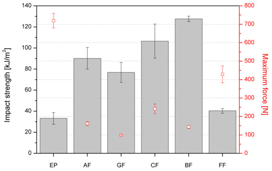 Charpy impact strength and corresponding measured Fmax during the test of the EP and EP-based composites.