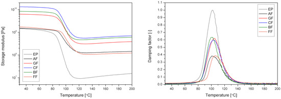 where G’g and G’r are the values of storage modulus determined in the glassy state and in the rubbery state, after passing the glass transition of the material. It is assumed that the smaller the value of C factor, the greater the effectiveness of the filler on the polymeric matrix. The highest values were obtained for composites reinforced with CF and inorganic fibers, while the lowest for composites reinforced with AF.