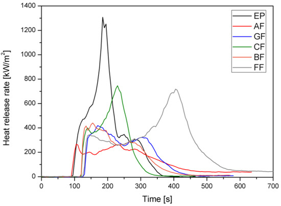 In Table 3, results from cone calorimetry tests simulating a developing fire scenario with the use of a small sample [80] are presented. An increase in time to ignition (TTI) was observed for all composites, excluding materials with aramid fabric, and the highest value was recorded for GF. TTI values strongly depend on density, thickness, and conductivity of samples; therefore, the more reliable parameter is heat release rate (HRR) versus time [81], shown in Figure 13. The representative curve of the heat release rate of unmodified EP presents a peak heat release rate at the beginning of the burning at ca. 200s. The curve consists of two main stages, the first of which gives the pHRR, and the second was a minor maximum. In the case of CF and FF, the opposite trend was observed, while, for AF, GF and BF, the first peak yielded pHRR, and then the significant flattening of the curves can be noticed. The use of fabrics resulted in a significant reduction in the pHRR compared to the unmodified resin, and the lowest results were determined for GF, AF, and BF. In the case of these materials, approximately the threefold decrease in the pHRR value was recorded. Another critical parameter used to predict a fire’s development is the maximum average rate of heat emission (MARHE) [82]. The lowest values were obtained for composites with glass and aramid fabrics. Furthermore, in almost all composites, a reduction in total heat release (THR) was noted; the only exception was composite with natural fiber, for which THR were higher by 27% than EP.