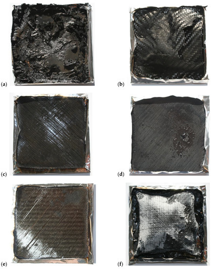 When selecting the appropriate reinforcement fibers, the fibers themselves’ strength properties should be taken into account, and additional technological aspects, including wettability by the selected thermoset resins, thermal resistance, and density. All these features contribute to the product’s final properties and the choice of the manufacturing technique. In recent years, even if the price criteria are still crucial at the stage of project and manufacturing on the large-scale, more attention has been paid to the sustainability of individual components that make up the final carbon and water footprint of a product [8,9]. Among the long fibers used in the production of laminates with a matrix of thermoset polymers, the most frequently used ones include glass fibers (GF), mostly S-glass and E-glass, depending on final purpose, i.e., tensile strength or chemical durability, respectively [6]. Manufacturing of the epoxy-based composites using GF fabrics allows achieving low-priced, and high-performance products [10,11,12]. To increase the mechanical strength and durability of epoxy laminates, it is common practice to replace them with carbon fibers (CF) [13,14,15]. They are not only resistant to stress corrosion and stress rupture failures like glass fibers but gain an advantage over other used reinforcements by additional functionality such as good electrical and heat conductivity [16]. This translates directly to the beneficial properties of composites developed with their participation [17,18,19]. Although basalt fibers (BF), similar to GF, often have more than 50% SiO2, their properties are much superior. Moreover, their production is characterized by lower energy consumption and less complicated manufacturing processes [20]. BF’s high strength, chemical, and thermal stability led to the wide application as a reinforcing material in polymer composites. The basalt fibers are well known for their excellent impact resistance; therefore, they are often used to hybridize laminates containing natural or synthetic fibers [21,22]. Synthetic fibers used as reinforcements are mainly made of heat-resistant and high-performance polymers such as polyamide or aramid. Aramid fibers (AF), showing properties comparable to inorganic fibers, are used in all applications where it is essential to reduce the final product’s weight [20,21]. Even though aramid fibers show a low adhesion to polymers compared to inorganic or carbon fibers [23], it has been shown based on Mai and Castino studies [24] that surface modification can significantly improve the interfacial interactions at the polymer-filler interface. In recent years, researchers have been very interested in using natural fillers to produce polymeric composites [25,26]. The introduction of long or short fibers from such plants as flax [27], hemp [28], jute [29], kenaf [30], banana [31,32] allows increasing the sustainability of the final composite in comparison to those reinforced with inorganic fibers. This is mainly due to reducing the constraints on disposal in the combustion process and sometimes the lower energy needed to produce the fiber filler itself [33]. Considering the high availability in Europe as well as one of the highest tensile strength (700 MPa) among natural fibers, the use of flax fibers (FF) seems to be particularly justified [34]. A significant limitation for natural fibers is their high hydrophilicity and porous structure, which directly translates into porosity in the final composite products’ structure [35,36].