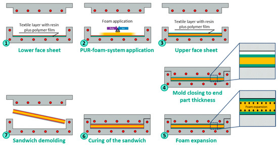 The basic idea of the intended process strategy is to use the pressure occurring during the PUR foam reaction for fiber impregnation and consolidation of the top layers. Following the example of Hopmann et al. [17] two independent material systems will be used for the foam core and the face sheet material. However, the target process is distinguished from Hopmann’s approach by the use of an impermeable boundary layer (polymer film) between the face sheets and the reactive foam system. This leads to a higher flexibility regarding the resin types for the face sheets (e.g., use of epoxy based systems) and prevents an uncontrollable penetration of the foam system into the face sheets resulting in locally increased porosity.
