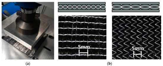For the compaction analysis, two layers (defined number of fabric layers per sandwich face sheet for the process development) of biaxial fabrics with the symmetric stacking sequence [(0/90) (90/0)] were compressed at a test speed of 1 mm/min within a standard testing machine (Hegewald and Peschke, Neu-Ulm, Germany, inspekt 50 table), shown in Figure 2a. The fabric has a different stitching yarn pattern on the top and on the bottom side due to the tricot stitching type (see Figure 2b). To achieve a symmetric layup regarding carbon fiber and stitching orientation, either the straight (C1) or zick-zack pattern (C2) can be placed on another. Both configurations were tested and compared. The compaction area was 150.5 × 161 mm2 and the fabric material was tested dry and pre-infiltrated with 100 and 500 mPa·s silicone oil. The mold was not sealed, which allowed resin flow due to fabric compaction. Each configuration was tested five times to ensure statistic liability. The fiber volume content, in relation to the applied pressure, were calculated using the Panex 35 carbon fiber density of 1.81 g/cm3 [19], plus measuring the compaction gap between base plate and compression stamp, and the samples weights.