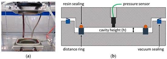 The foaming pressure development inside the cavity over time was our main focus regarding the foam material development. To characterize the foaming pressure of various system formulations, a circular plate geometry with 150 mm diameter and adjustable height is used (see Figure 3a). The developed trial setup was operated by an electric cylinder (Festo SE & Co. KG, Esslingen am Neckar, Germany ServoPress YJKP-17-400-AX-SB-5) that allowed the programming of the closing profiles and highly accurate movements of the mold to be carried out. Figure 3b shows a schematic cross section of the mold. The vacuum sealing evacuated the cavity during the process and the resin sealing prevented leakage of the foam material. The cavity height can be adjusted via distance rings, a pressure sensor (Kistler Instrumente AG, Winterthur, Switzerland, type 6167A, 10 Hz measuring frequency) was installed in the upper mold for online recording the pressure values and both cavity sides were water-heated to 80 °C.