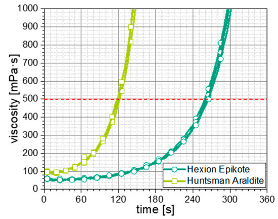 Figure 4 shows the determined viscosity behavior over time for both epoxy resin systems at 80 °C up to 1000 mPa·s. It is obvious that the Epikote system has a lower reaction speed than the Araldite system. The time to reach a viscosity of 500 mPa·s is ~120 s for Araldite and ~260 s for the Epikote system. Both materials show a slight temperature-dependent decrease in viscosity in the beginning of the tests, which is then overcome by the crosslinking reaction of the polymer that leads to an increasing viscosity during curing. For the Epikote material, this results in a comparatively long time below 100 mPa·s of about 140 s against the Araldite system.