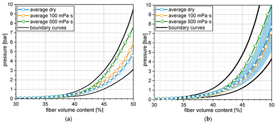 The configuration in Figure 5a (C1 configuration) shows a dependency of the necessary pressure for compacting the fabric to a certain FVC on the impregnation situation. The average pressure curves increase from dry fabric over 100 mPa·s to 500 mPa·s. This effect is due to the necessary additional pressure to enable the fluid flow (fluid pressure) during the compaction trial in case the fabric is impregnated, also investigated by Poppe et al. [22]. The higher the viscosity the higher the necessary additional pressure. It must be mentioned that this effect is valid for the average pressure values, but the enveloping surfaces representing the standard deviation overlap and the effect, is thus, not generally valid. A similar behavior can be observed in Figure 5b (C2 configuration) from dry fabric to 500 mPa·s. The average values for 100 mPa·s are slightly lower than for dry fabric and very close to each other. In general, the C2 configuration shows higher necessary pressures to achieve a certain FVC. This is due to the different surface textures of the 50 K based CF fabric. On the straight stitching side of the fabric, the 50 K rovings were subdivided into smaller fiber bundles by the stitching yarn (see Figure 2b). This resulted in a smoother surface compared to the zick-zack side. As the compaction was characterized by only using two layers of fabric, singularities like local fiber accumulations could not be homogenized using thickness direction. These singularities are less likely if the surfaces within the symmetry plane are smoother like for the C1-configuration and thus the necessary compaction pressure is lower. The effect of the local singularities partially superimposes and blurs the viscosity influence on the compaction behavior for the C2 configuration. The C1 configuration is preferable for the D-SCM process as less pressure is needed for the face sheet compaction and thus higher FVC are achievable.