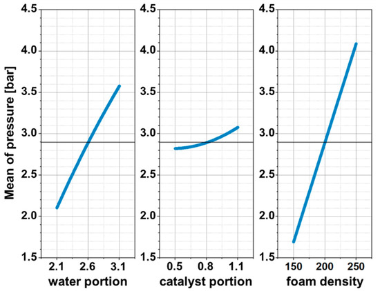 The design analysis of the performed FCCCD-based DoE shows an R-square of 99.53% and an adjusted R-square of 99.39%, and is thus, considered valid for well-founded conclusions on the material characteristics. The main effects plot for the influence of the factors water portion, catalyst portion and foam density on the maximum foam pressure is shown in Figure 6. We observed that the higher the gradient of the curve, the higher the influence of the factor on the maximum foam pressure.