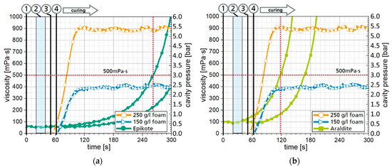 The following discussion explains the identification, for the first time, of the theoretical processing windows, based on the individual material characterizations, taking the chronological order of the process steps into account. The realization of the D-SCM process is not part of the paper. The process is dominated by manual process steps for the first investigations. The reactive polyurethane foam mixture is introduced into the cavity 20 s after the first impregnated textile layer plus polymer film (first sheet) is placed in the heated mold (1). The foam application time is estimated with 20 s (2) and the second impregnated textile layer plus polymer film (second sheet) is placed in the mold 10 s after foam application end (3). Twelve second mold closing time is defined within the experimental setup program (4), followed by the system curing and sandwich demolding. Figure 8 shows exemplary process strategies for both resin systems (Figure 8a for Araldite, Figure 8b for Epikote) in the face sheets as well as 150 g/L and 250 g/L foam density, based on the independent material characterization. The resin viscosity is plotted on the left and the expectable foaming pressure on the right y-axis.