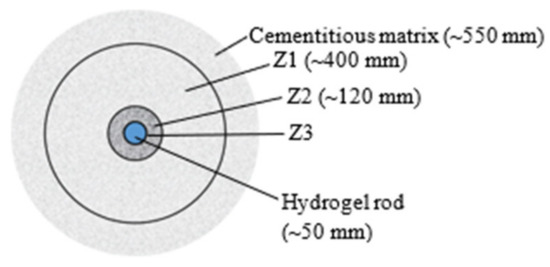 Figure 2. Schematic showing the hydrogel rod and three different zones, Z1, Z2, and Z3, in the cross-section of the cement paste samples.