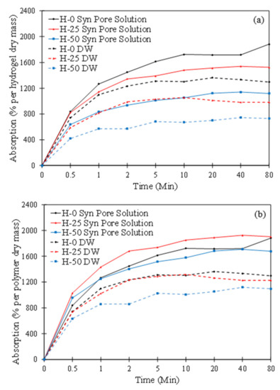 The absorption calculated per dry mass of polymer and NSi and the dry mass of polymer only is shown in Figure 3a,b. It can be seen that the absorption of the hydrogels is higher in the synthetic pore solution than in DW. The increase in absorption in the synthetic pore solution could be attributed to the high pH of the synthetic pore solution, compared to distilled water. At high pH, the hydrolysis of amide groups to negatively charged carboxylate groups provides more repulsive forces in the hydrogel networks leading to increased swelling of the hydrogels [15]. It is interesting to note that the effect of cations including Na+, K+, and Ca2+ in the synthetic pore solution, which reduce absorption through the screening effect and complex formation [8,15,23], did not appear to overcome the absorption increase due to pH increase. It can be seen in Figure 1a that the hydrogels with NSi showed a lower absorption than the hydrogel without NSi. This is to be expected, as the NSi in the hydrogel does not absorb solution and a lesser amount of polymer that can absorb solution is present in the hydrogels. The absorption results shown in Figure 1a are in general agreement with the absorption trend determined using the flow test discussed previously. It is noted from Figure 1b that in distilled water, H-50, showed a lower absorption compared to other hydrogels. A possible reason for this behavior could be the electrostatic association of negatively charged NSi and partially positively charge amide groups in the hydrogel network constraining the swelling of the hydrogels [43]. In the synthetic pore solution, H-25 showed a slightly larger absorption than the other hydrogels in the early part of the absorption.