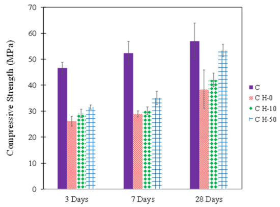 The compressive strength of the control cement paste, C, and the cement pastes containing hydrogels, C H-0, C H-10, and C H-50, is shown in Figure 4. It is seen that the cement paste with hydrogels exhibited a lower compressive strength compared to the control cement paste. This reduction was also observed in prior works and is attributed to the presence of macrovoids in the microstructure when hydrogels are introduced into the cement paste [8,9,16,17,50]. An increase in compressive strength with increased concentration of NSi in the hydrogels can be noted. The reason for this could be a lower absorption of hydrogels with increased concentration of NSi, as demonstrated in Figure 1a and the flow results, as discussed previously. The macrovoid size is directly related to the absorption of the hydrogels. Thus, the pastes with a higher hydrogel absorption experienced a higher reduction in compressive strength. There could be a possibility of the pozzolanic reaction between NSi in the hydrogel and Ca(OH)2 generating further hydration product within the hydrogels in the macrovoids. The possibility of the pozzolanic reaction was shown and discussed in a work by Krafcik et al. [43]. In addition, as discussed later in this paper, the formation of C-S-H as a result of pozzolanic reaction between hydrogels containing NSi and Ca(OH)2 was demonstrated. More investigations are required to quantitatively determine the amount of C-S-H within the macrovoids and its contribution to the compressive strength of the pastes.