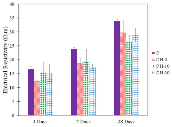 where R (Ω) is the measured resistance corrected for the resistance of the two pieces of wetted foam, a is the cube thickness (m), and S is the cube surface area in contact with the electrode (m2). The test was conducted with five replicates and averaged. It should be noted that the electrical resistivity of the cement paste cubes is dependent on the morphological characteristics of pores and the chemistry of pore fluid in cement paste. Thus, this test provides information about the microstructure and transport characteristics of cementitious materials [47,48].