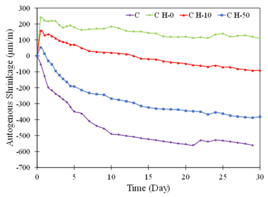 The autogenous shrinkage of the control cement paste and pastes with different hydrogels is shown in Figure 6. It is seen that the pastes with hydrogels showed a decrease in autogenous shrinkage compared to the control cement paste. The effect of hydrogels on the reduction in autogenous shrinkage was different. Their effect followed, as C H-0 > C H-10 > C H-50. All pastes containing hydrogels showed an expansion after the setting time, and this expansion was the highest in C H-0, followed by C H-10 and C H-50. Such an expansion after setting, resulting from the addition of hydrogels in cementitious materials, has been previously documented in the prior investigations and was attributed to Ca(OH)2 crystallization pressure [8,27]. After the initial expansion, all pastes containing hydrogels demonstrated a gradual shrinkage and this shrinkage was more pronounced in C H-50 and C H-10 than C H-0. The autogenous shrinkage of C H-0 remained relatively unchanged after the initial expansion. The absorption and desorption behaviors of the hydrogels appeared to play key roles in the effect of hydrogels on the autogenous shrinkage of the cement pastes.